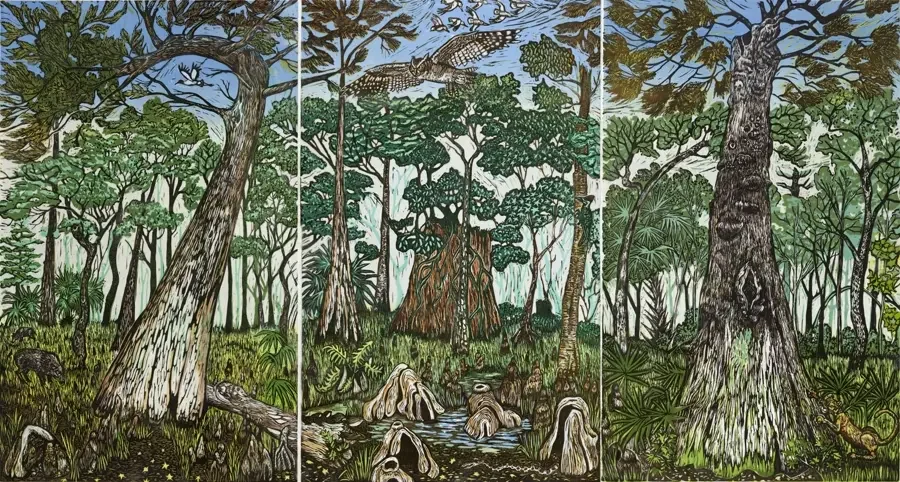 This piece, which I called Goethe Triptych, it portrays these giant old-growth cypress that were left standing because their knobs and twists and curves weren't useful to loggers.