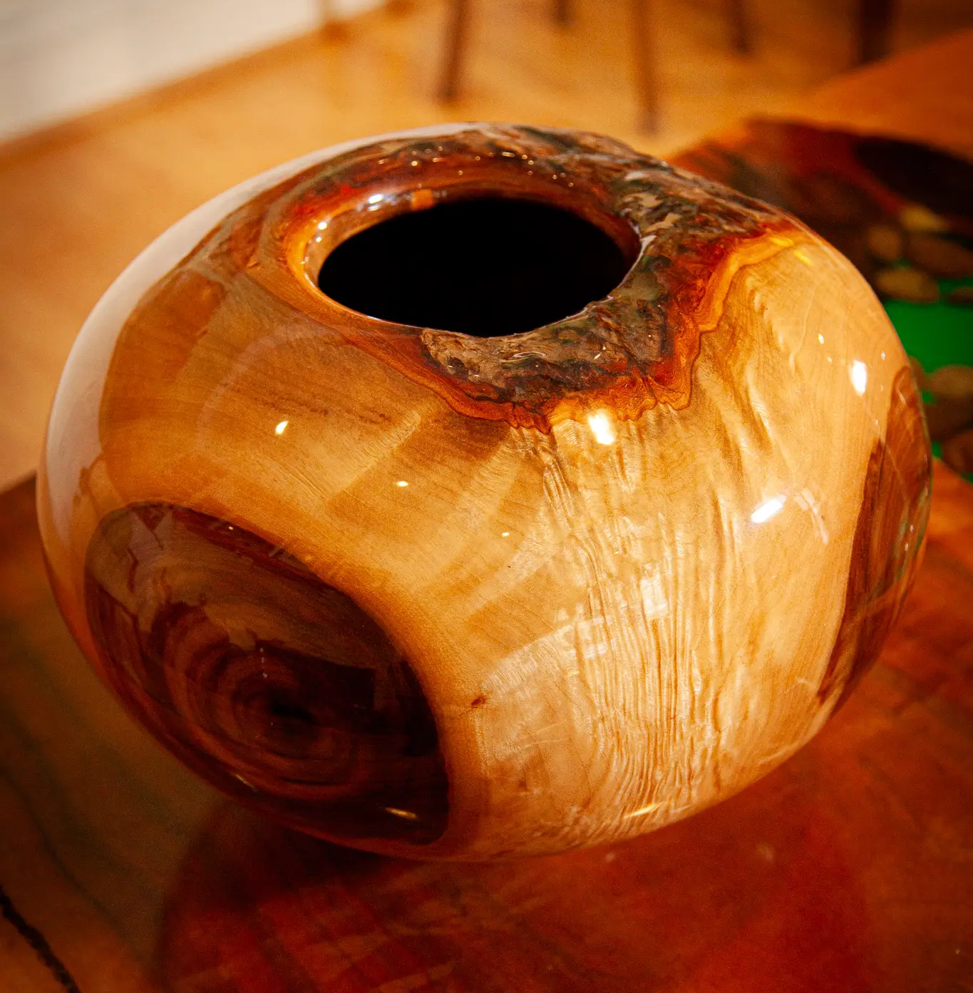 Today I've made over 800 pieces, it's flabbergasting to think back on it, and I usually have about 100 pieces in inventory at a time. Some things sell, some things don't, and sometimes I can totally blow it like anybody. I work with bright red camphor, an invasive and ethically harvested wood, along with woodturning mainstays like starry Norfolk Island Pine, Ambrosia Maple, and spalted Flame Box Elder.
