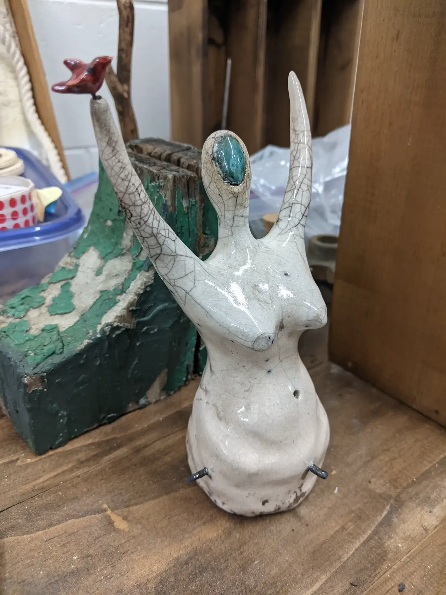 To convey metamorphosis, I might use actual luna moth cocoons -- which are empty of course! To convey love and creation, I incorporate rosary beads and pearls. Often, my themes guide my choice of materials. The turquoise tones in the clay come from copper screens, which migrate into the clay during firing. Even steel can migrate a yellow tone into the clay. I like the variations and happy mistakes, sometimes the materials have intentions of their own.