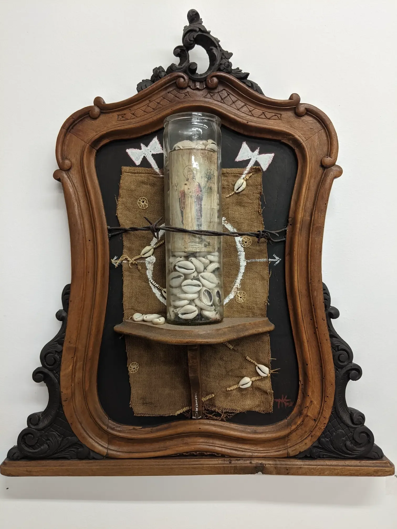 When BLM happened, I did a piece and showed it at the Polk Museum. Running Man was about the lack of care for indigenous people, the neglect of basic needs like water, food, anything. It's a motif of mine to depict figures in confined spaces, and this might resemble captivity, but it is actually about diaspora. The figure might be oppressed or held back, but you can see the heart glowing in the chest. Although he's in the box, he has a strong posture. Many interpretations, that's art.