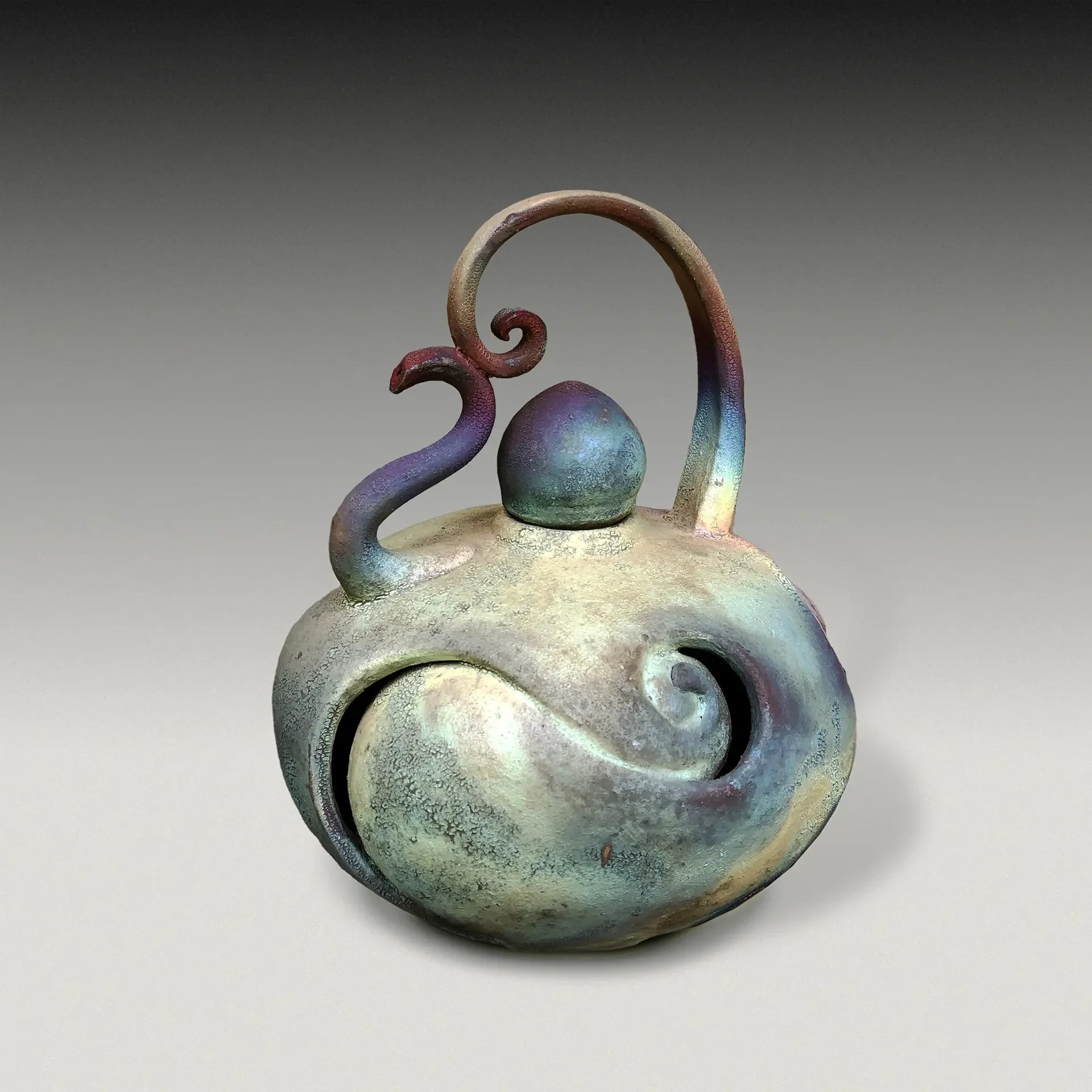 I'm always experimenting, trying different forms and techniques. Eventually, this will lend a somewhat different look to my work. In particular, I'm exploring a different glazing technique: de-emphasizing the raku and emphasizing the intricate carving details in the piece. Raku works best on a smoother surface, and in a very carved piece, the raku colors can hide these details.